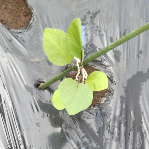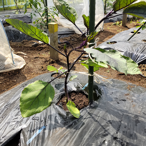 苗の定植の2~3週間前に畝を作り、肥料を入れてよく耕し黒マルチで覆っておきました。そして本日、苗を定植しました。植えた後は土をしっかり押さえ、水をたっぷり与えました。また、苗が風にあおられたとき、苗が折れないように仮支柱(90cm)を斜めに立てて麻ひもで苗を固定しました。