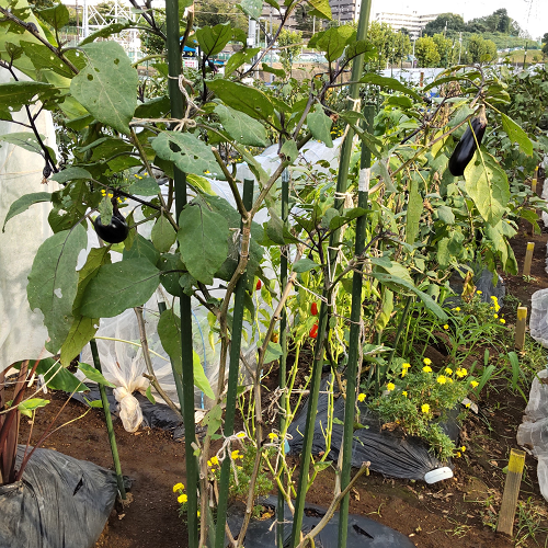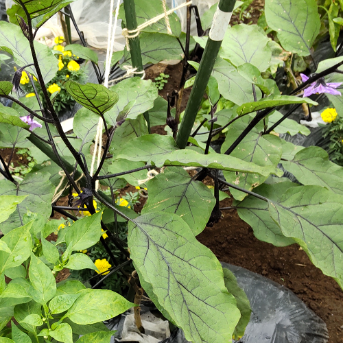 ナスのそばにマリーゴールドを植えていますが、害虫よけのためです。