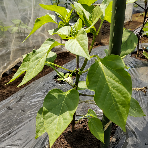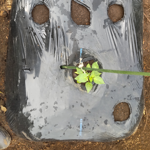 苗の定植の2~3週間前に畝を作り、肥料を入れてよく耕し黒マルチで覆っておきました。そして本日、苗を定植しました。植えた後は土をしっかり押さえ水をたっぷり与えました。また苗が風にあおられたとき苗が折れないように仮支柱(90cm)を斜めに立てて麻ひもで固定しました。