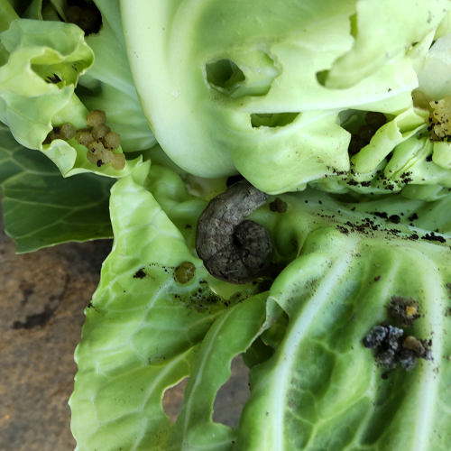 先週見つけた虫食いのあるキャベツですが、虫食いがひどくなっているので収穫しました。そうすると球の内部に1匹まるまると太ったヨトウムシがいました。中心に向かってどんどん食べられていました。無農薬で栽培しているので虫との戦いです。負けました。残念です。残りのもう1球は大丈夫なのでもう少ししたら収穫します。