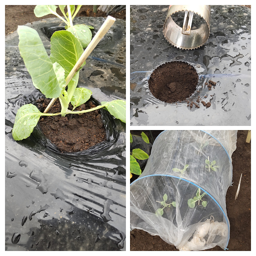 マルチカッターで黒マルチに穴をあけて苗を植え付けました。植え付けた後は土をしっかり押さえ、水をたっぷり与えました。また、苗が風にあおられたとき、苗が折れないように割りばしを苗にそえて差しました。