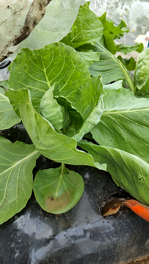 結球が始まりました。但し、1球に虫食いがありました。虫を探したけど残念ながら見つけられませんでした。仕方がないので「唐辛子焼酎液」を噴霧しておきました。「唐辛子焼酎液」は虫が嫌うので、虫が逃げてくれるといいんですが…。